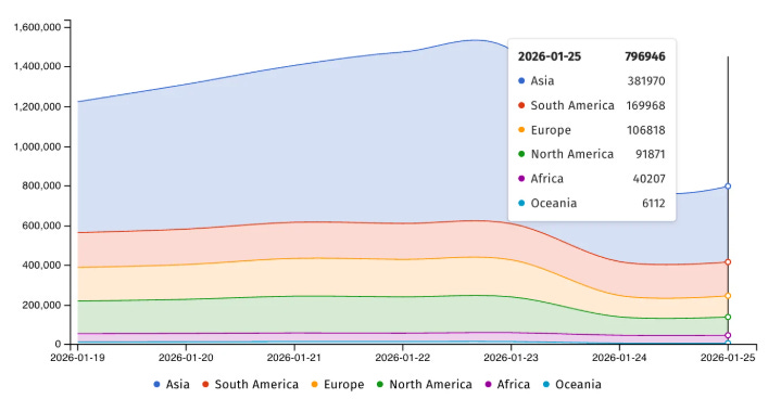 Uno de los datos más preocupantes es la distribución geográfica de los sistemas expuestos. Shadowserver informa que casi 170.000 IPs vulnerables se encuentran en Sudamérica, una cifra solo superada por Asia, que concentra más de 380.000 servidores, y por encima de Europa, con algo más de 100.000. No está claro cuántos de estos sistemas ya aplicaron el parche, lo que deja a la región especialmente expuesta.