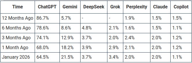 ChatGPT está cayendo en su participación de mercado web, según un informe reciente de SimilarWeb, difundido por BleepingComputer. En enero de 2026, su cuota rondó el 64,5 %, una caída de alrededor de 20 puntos porcentuales respecto a enero de 2025, cuando dominaba con cerca del 86 % del tráfico de IA. En paralelo, Google Gemini logró superar el 20 % de participación, consolidándose como el competidor más fuerte en el ecosistema de chatbots y herramientas de IA accesibles desde la web.