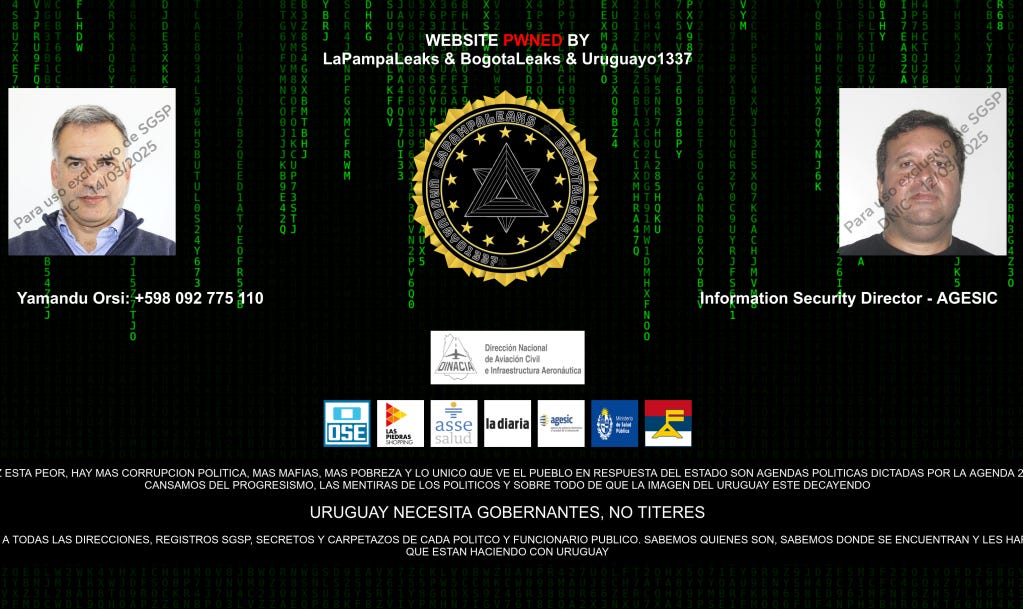 El 17 de marzo de 2025, el sitio web oficial de la Dirección Nacional de Aviación Civil e Infraestructura Aeronáutica (Dinacia) de Uruguay sufrió un ciberataque que resultó en la alteración de su página principal. Los atacantes publicaron una imagen que incluía la fotografía y el supuesto número de teléfono personal del presidente de la República, Yamandú Orsi, así como la foto de la cédula de identidad de Mauricio Papaleo, director de Seguridad de la Información de la Agencia de Gobierno Electrónico y Sociedad de la Información y del Conocimiento (Agesic).
