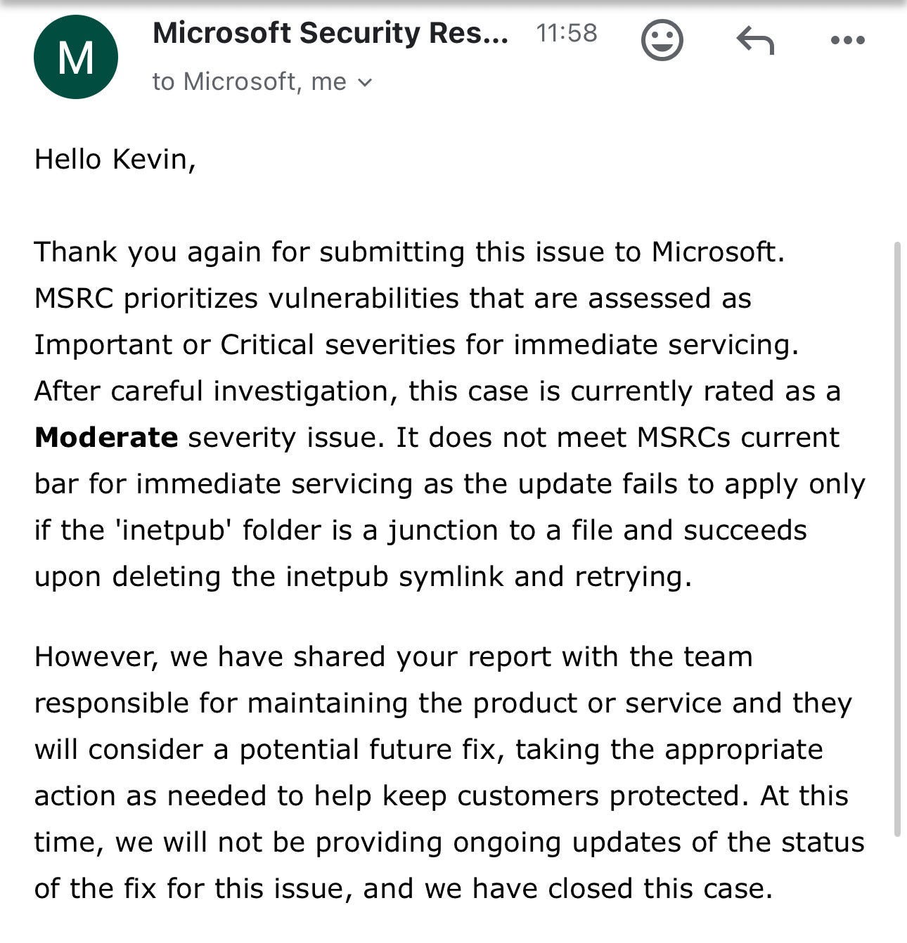 Tengo la sensación de que los proveedores de EDR, incluido Microsoft, probablemente quieran agregar detección para puntos de unión creados desde \inetpub en unidades de arranque, ya que parece que este problema no se solucionará pronto y es una forma 100% confiable de detener futuros parches de seguridad en Windows.