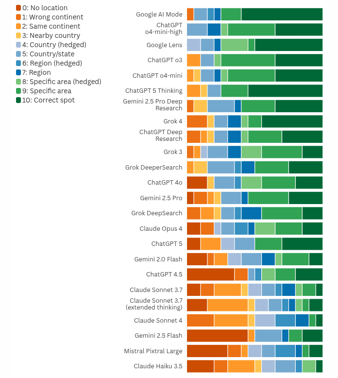 Pero sorprendentemente, en esta nueva prueba, GPT-5 mostró un importante retroceso, dando muchos errores y respuestas muy poco precisas. Incluso en sus versiones de pago y con modo Pro, su desempeño en geolocalización fue peor que en la versión anterior.