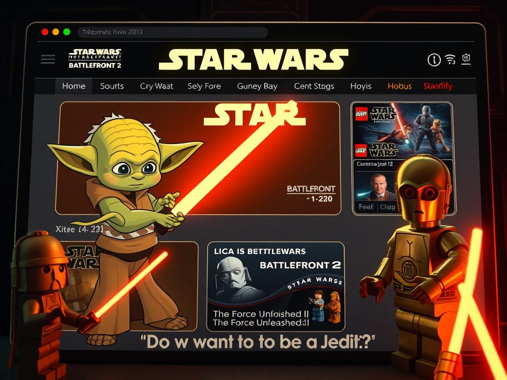 "Te gustarán estos juegos", dice la cita junto a una caricatura de Yoda en el sitio web starwarsweb.net . Entre estos juegos se incluyen Star Wars Battlefront 2 para Xbox; Star Wars: El Poder de la Fuerza II para Xbox 360 y Star Wars: La Guerra de los Clones: Héroes de la República para Nintendo Wii. Junto a ellos, hay enlaces a una tienda en línea de Star Wars con el eslogan "¿Quieres ser un Jedi?" y un anuncio de un set de Lego Star Wars.