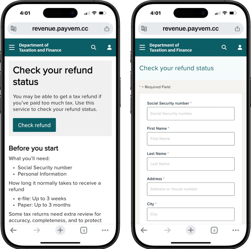 Durante las últimas semanas, BleepingComputer detectó una campaña de smishing (phishing a través SMS) que se hace pasar por el Departamento de Impuestos y Finanzas de Nueva York, haciendo creer a las personas que deben completar un formulario para recibir la devolución de dinero. El mensaje promete un depósito rápido si se ingresa información bancaria antes de una fecha límite, y amenaza con “perder el beneficio” si no se cumple el plazo.
